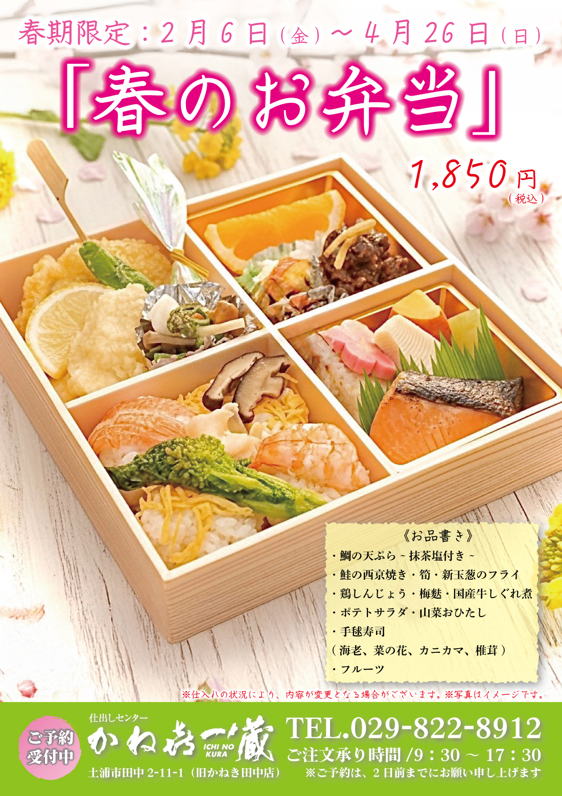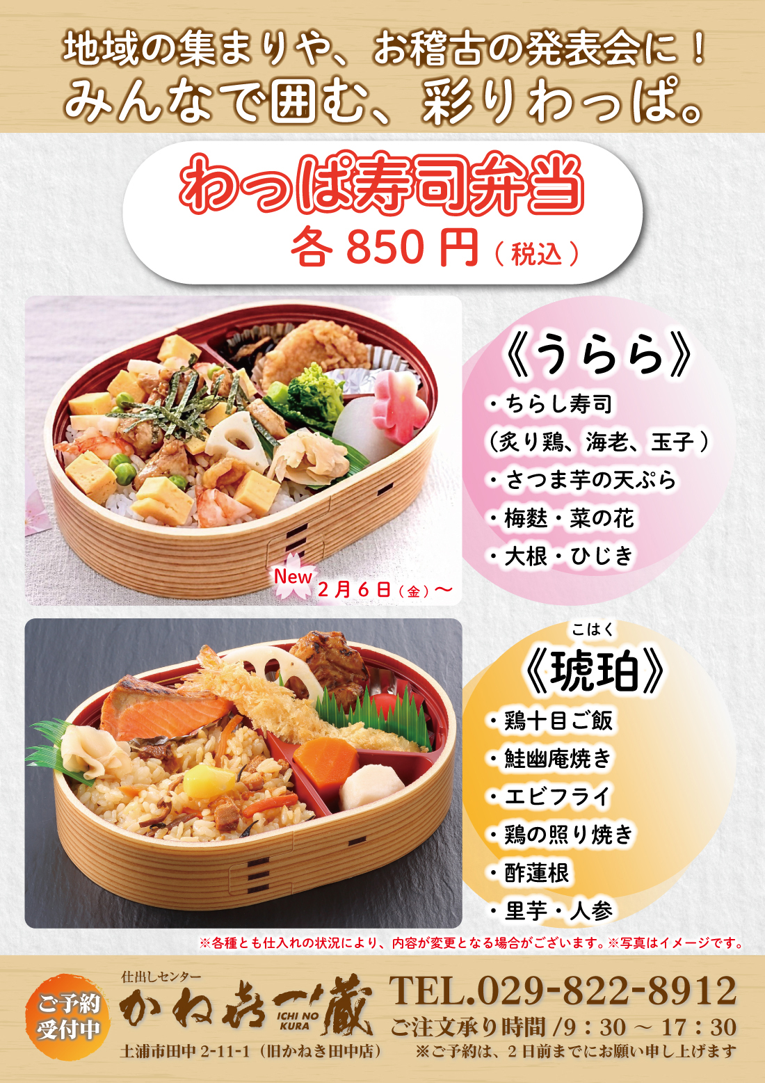 2026年2月6日 / 最終更新日 : 2026年2月6日 admin お知らせ 【一ノ蔵】新商品のご案内 旬の素材を吟味し仕上げた、“春の味覚”が楽しめるお弁当です。かねき一ノ蔵で販売いたします。 🌸わっぱ寿司弁当【うらら】🌸 ▲ チラシを拡大 🌸季節限定【春のお弁当】🌸 ▲ チラシを拡大 ※お弁当の詳細は、一ノ蔵サイトの商品ページ(下記のリンクボタン)でご覧ください。 わっぱ寿司弁当【うらら】 わっぱ寿司弁当【琥珀】 季節限定【春のお弁当】 ご予約は、かねき 一ノ蔵の店頭と電話で承ります。かねき 一ノ蔵 茨城県土浦市田中2-11-1 <店舗詳細> TEL. 029-822-8912(電話受付 10:00~18:00/無休)